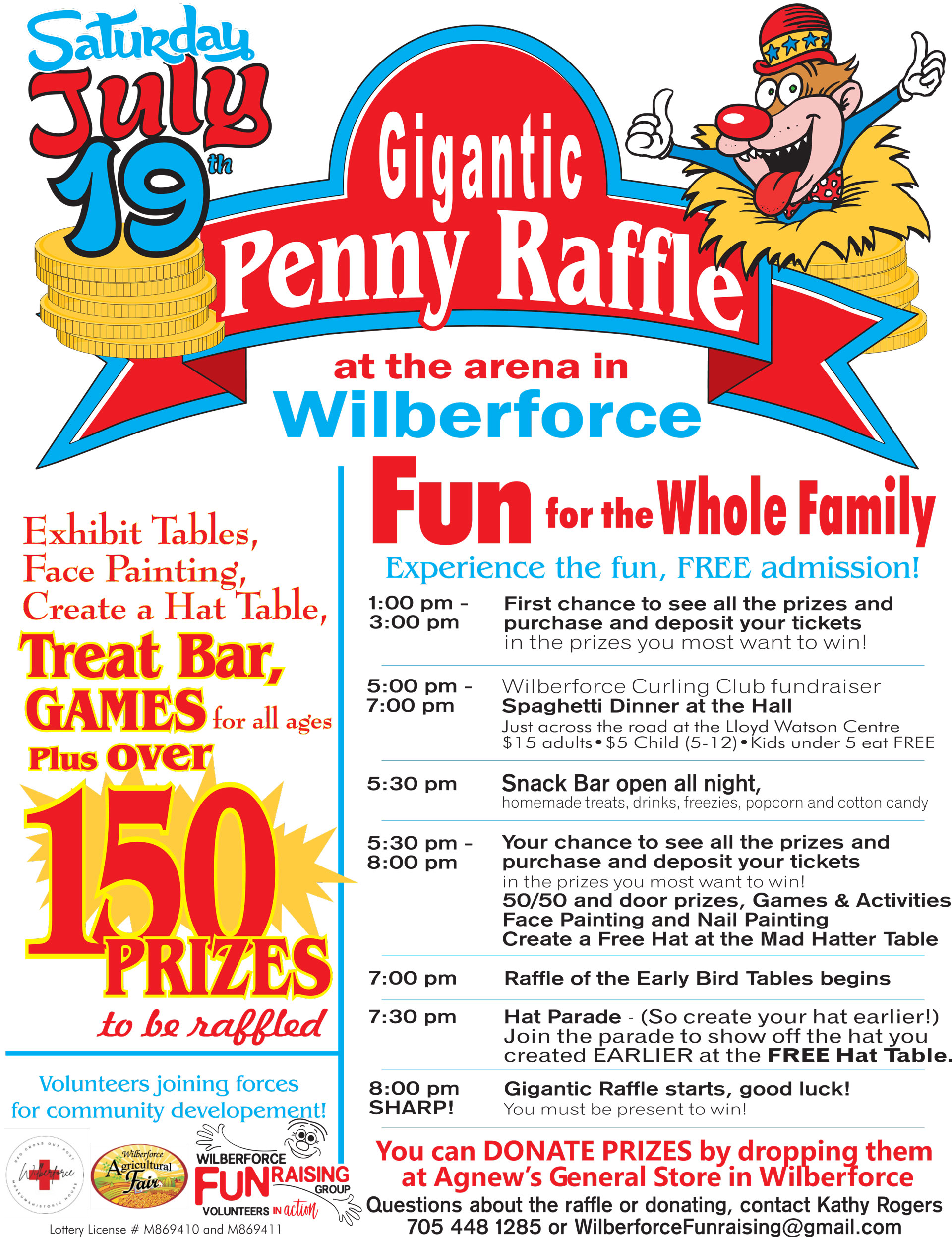 Brought to you by the Wilberforce FunRaising Group with support from the Wilberforce Heritage Guild and the Agricultural Fair Board. For questions or to donate prizes please contact Kathy Rogers at 705-448-1285 or by emailing WilberforceFunraising