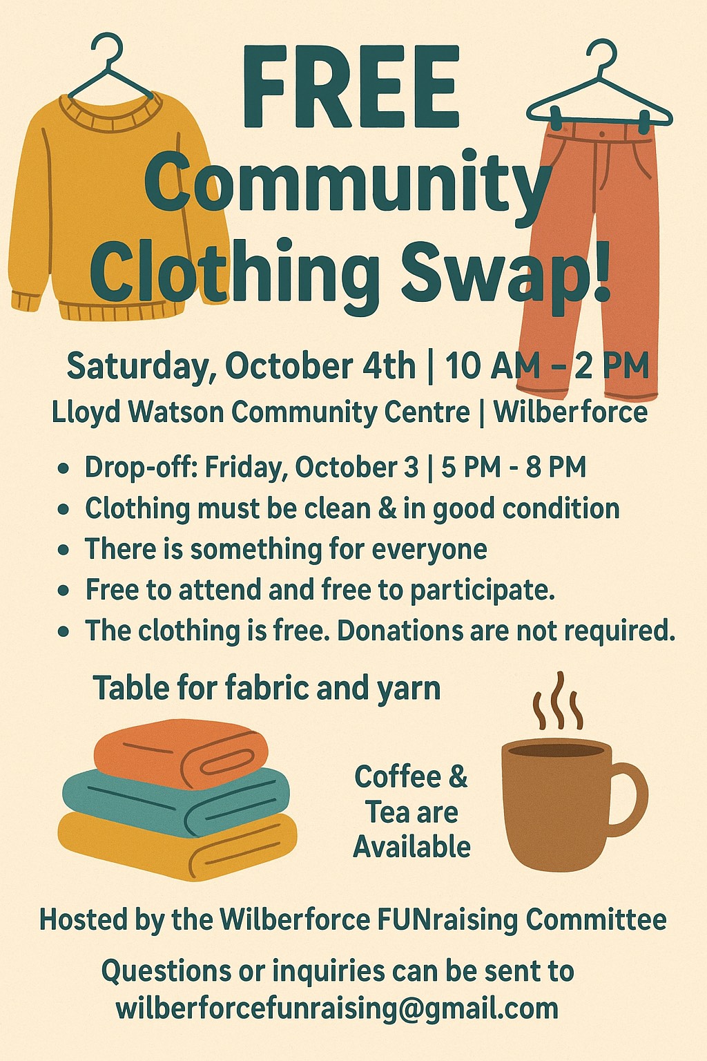 Drop-off on your no-longer needed clothing items on Friday, October 3 from 5 PM to 8 PM and then come back on Saturday, October 4 from 10AM to 2PM at the Lloyd Watson Community Centre for a FREE Community Clothing Swap!